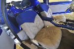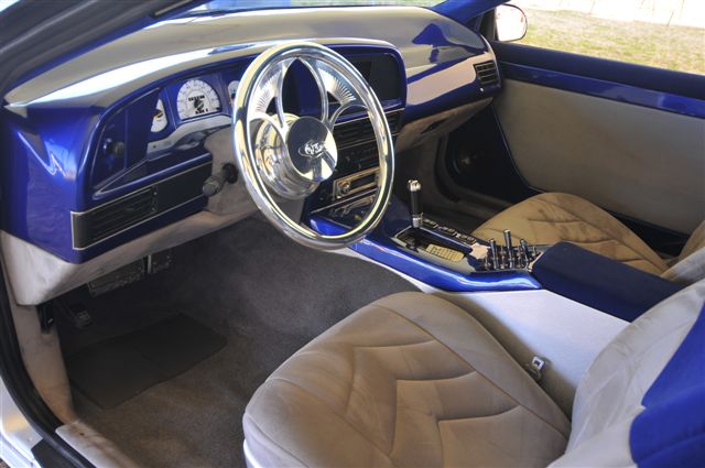 Fully custom blue tweed interior including door panels, window pillars, kick panels, kick plates, custom rear panels, package tray, and headliner