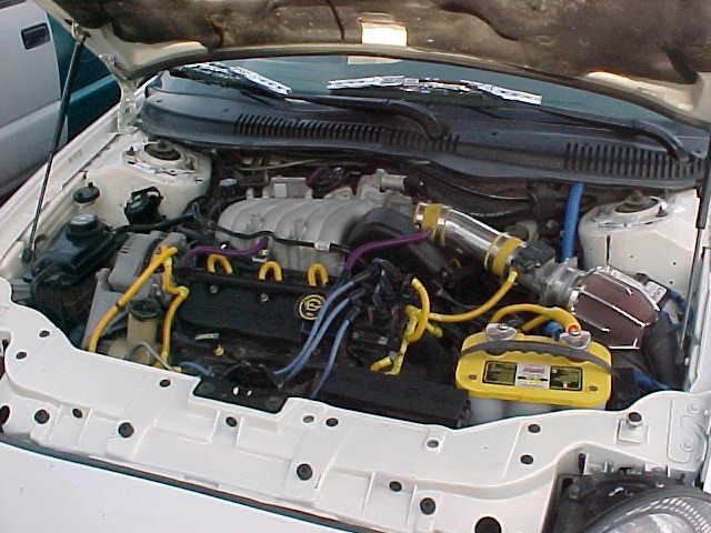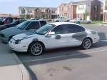 Painted in all PPG, Ultra white and blue pearl. Shaved rear door handles, gas door, hood squirters, rear emblems, and frenched antenna, full blue under carriage neon, blue strobing headlights. Have a 2002 cavalier rear window wrap wing with L.E.D brake light. Put gas filler behind right brake light, working out the flipping brake light still, custom made lower front bumper grills to protect hyper-white fog lights with blue L.E.D.'s. Changed the Head and Parking lights to Silver Star's.