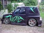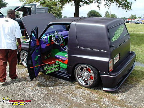 *FOR SALE-$5000.* dash dyed purple w/ neon green and florescent orange trim, florescent green carpet with florescent orange floormats, purple and neon green vinyl interior w/3-d tribal graphics, custom stainless steel dash trim, purple and green neons and LEDs, color-shifting tach. Acrylic and chrome color shifting steering wheel.