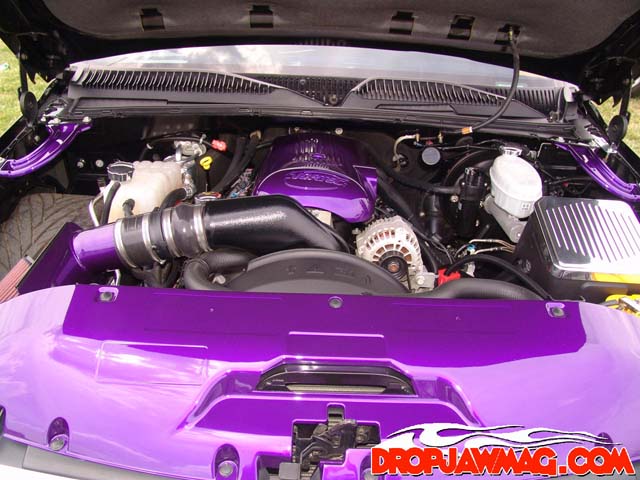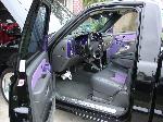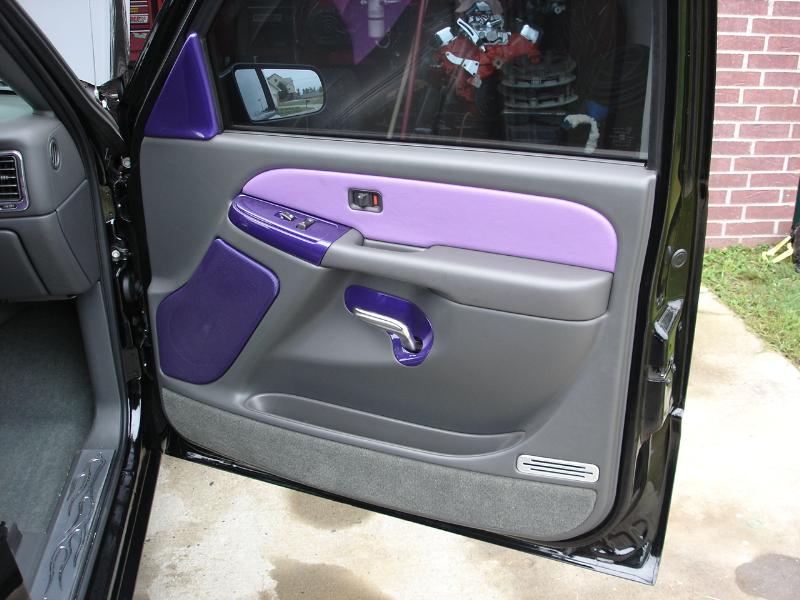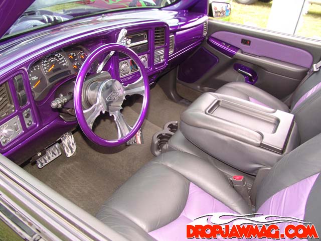 ///Billet dash pieces, billet shifter, billet flame pedals, billet flame door sill plates, billet ac and headlight knobs, billet door lights, billet trim for ac vents, interior escalade handles, dash and door pieces painted purple, Classic Soft Trim purple and gray leather, painted dash and a B.A.D. steering wheel