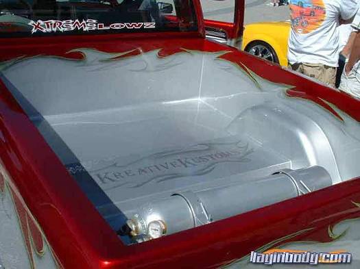 shaved: stake holes, handles, tailgate, roll pan, cab seams, full sheet metal inner bed w/ relocated gas door, 96 caddy lights, 02 denali front clip, smooth wiper cowl, painted Kandy Brandywine, Ford Frost silver, and Green apple (paint and bodywork by Tim Armstrong of Kreative Kustoms in Ashland City, TN)