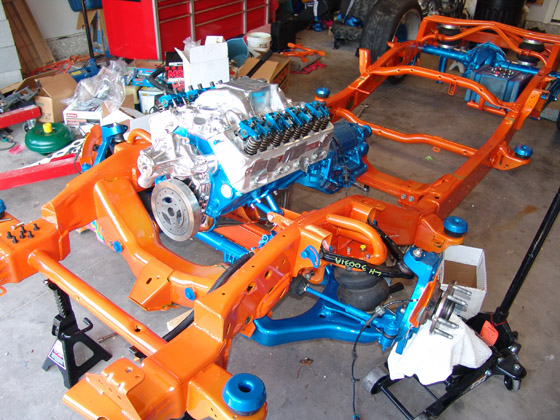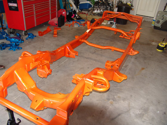 powercoated frame, custom tube bag mounts, billet 2600's up front, 2" spindles, rear frame was backhalfed, notched for 22's, billet 3600's,extreme GC 450 all around,full SS 1/2" harline painted suspension/brake/drivetrain components, custom made driveshaft, 4 link with panhard, 3 1/2" body drop