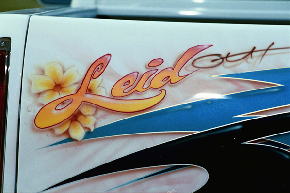 shaved hadles,3rd brake, tail lights, caddy lights, shaved front bed, back of the cad and fire wall, paint and body by Todd Boatrite, graphics by Chrales "The KID" Armstrong