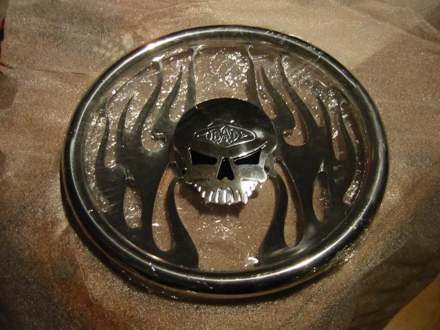B.A.D. (full billet) Inferno skull steering wheel and a custom made billet shifter. Trenz flamed rearview mirror.