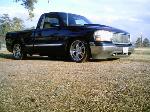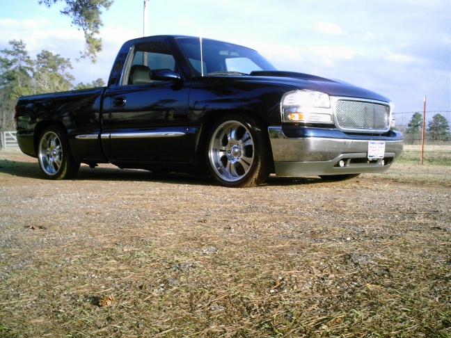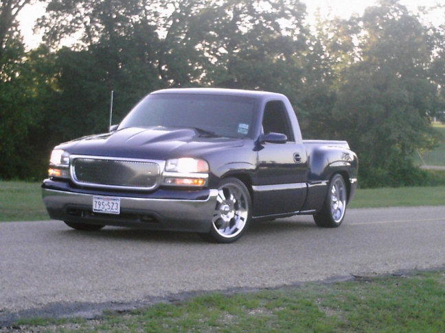 Goodmark cowl hood, speed grill, Tahoe painted door handles, billet antennae, Denali projectors, swapped for a fleetside bed, shaved tailgate and smooth rollpan