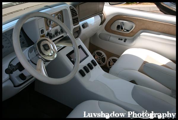 All of the Interior Plastic is smooth and painted White, White Vanel Headliner, White Seats w/ tan suede inserts, White Door Panels w/suede inserts, speaker box kickpanels middle concole all fiberglassed and painted, dash wrapped in light tan leather