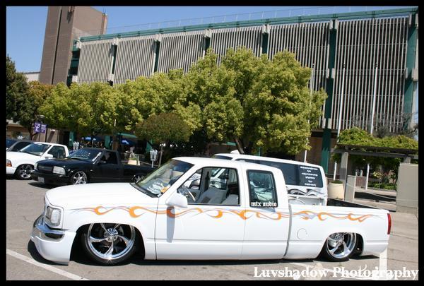 White with a house of color orange and silver design (done by settin trends), 99 Cadi Front-end, with a 06 GMC Bumper, painted bumper, Shaved Tailgate Rollpan handles antennea, Billet Grill, Clear Parking Lights Corners, Clear Windows All Around, Gaylord Tonneau