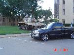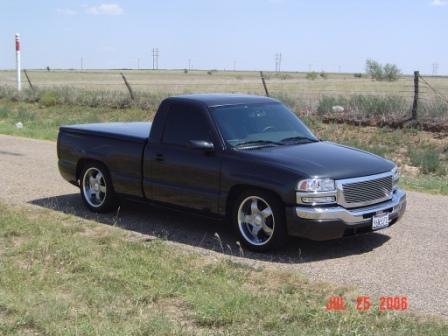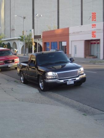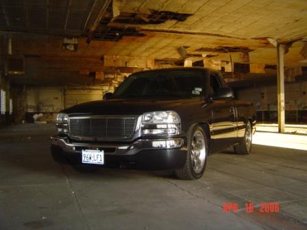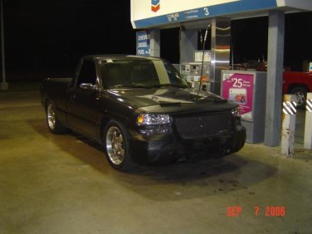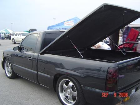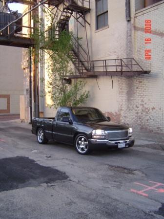 Dark Spiral Gray Metalic paint, Removed moldings and emblems, 8% tint on the windows, Smoked tail lights, Carriage Works billet grill, custom fiberglass front bumper, color match street scene mirrors, denali back door handles (NO key holes), color match snug lid, TYC denali style projector head lights, TYC clear parking light, Sir Michaels steal roll pan, shaved tail gate,60 inch.L.E.D. (Body work done by Larry at KUSTOM BIKES).