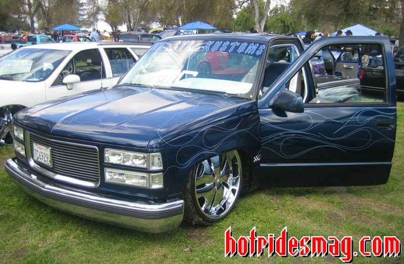 custome made blue with a white pearl top, diamond clear corners and parking lamps, angel headlamps with icy blue bulbs, billet grill, billet antenna, roll pan, shaved doors, third brake light and tailgate handle. three 15.5 inch led's in the rear...check...the way i did it has never been done....yessss