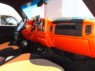 New interior half-way installed, fiberglassed and painted door panels, painted dash, black tweed headliner, a-pillars, and orange and black tweed seats, nu image flamed gauges, trenz billet pedals, B.A.D. inferno steering wheel w/ skull horn button, shaved all pockets off all door panels, not completed center console, and back door panels