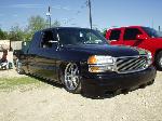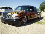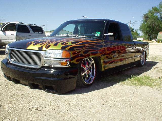 House of Kolor Tangelo pearl shaved door handles and taillights, third brake light, stake pocket holes, amd rain gutters, moldings, emblems, and gas door, shaved license plate brackets, beefy billet grill, Denali Headlights, molded in tailgate skin and roll-pan, shaved and relocated mirrors, billet tailights and mirrors, 40"x40" sliding ragtop, billet wipers
