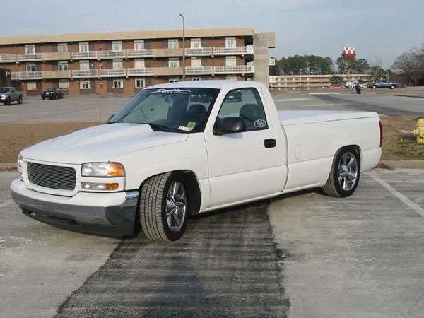 billet grille with painted perimeter, bed cover,molded roll pan, cowl hood, painted mirrors, shaved tailgate, and some stickers