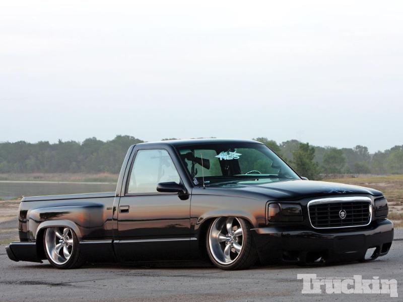 Cadillac front clip, 2000 model GMC rear bumper painted black, shaved stake pockets, and tailgate handle, pinstriped by bobby pitre, smooth wiper cowl, street scene sport mirrors