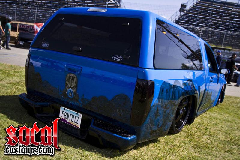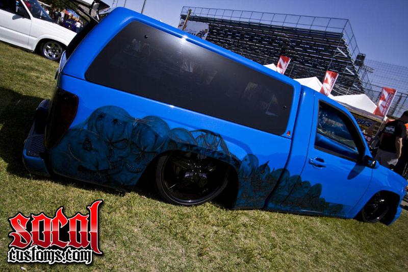 Truck has nothing shaved besides the drip rails and 3rd brake light. Its all painted Toyota voodoo blue pf the fj. Has skull graphics going from bottom of the front fender all the way to the top of the tailgaters. Running a leer camper shell now with big side windows. Has a cowl hood, upper and lower black grilles