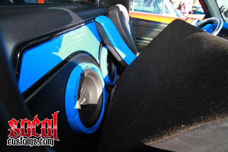 Dash is fully glassed and shaved and painted to match. All the other panels painted a matte black. Seats and headliner are black leather with a grey suede. Billet Bonspeed steering wheel. And a one off snap on torque wrench for the shifter. Has a full custom fiberglass and painted console that runs from the dash to the sub box. Holds the air zenith digital air gauges my switches and the shifter.