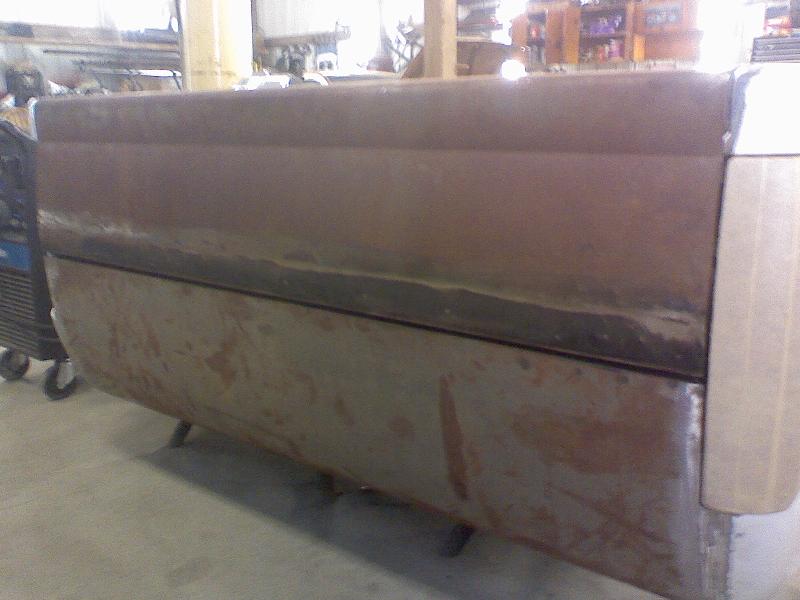 "Half-Gate" half skinned fully functioning tailgate that meets the raised bed floor. Shaved gas filler door, custom pop-up gas door from Hot Match. Completely custom hand-built hood.