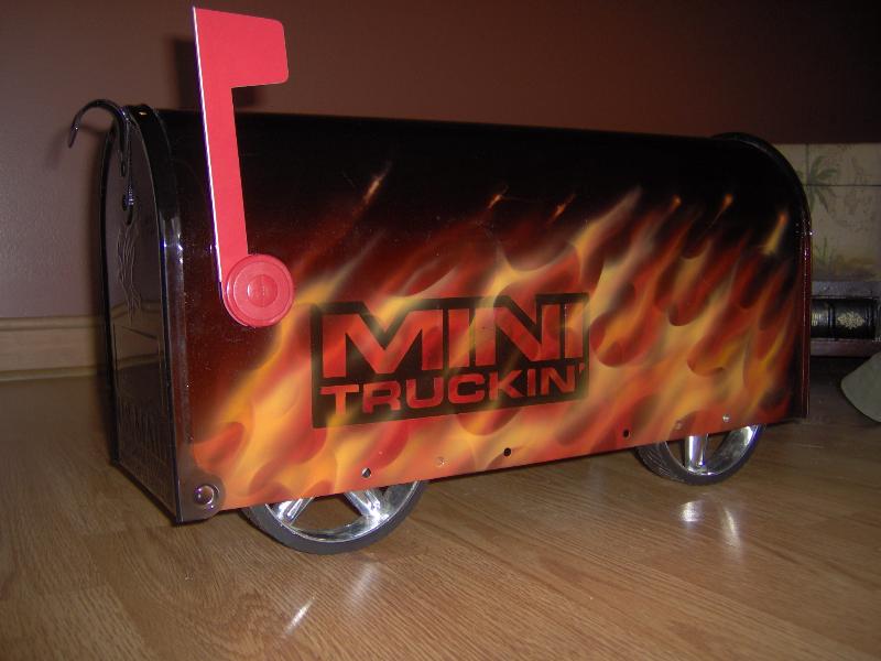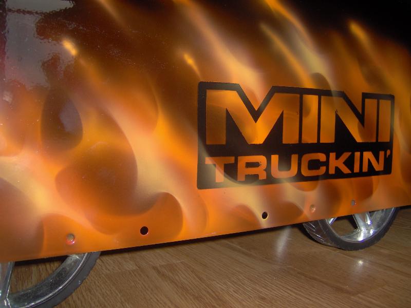 black with real flames airbrushed and minitruckin mag logo inserted into flames.