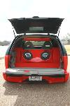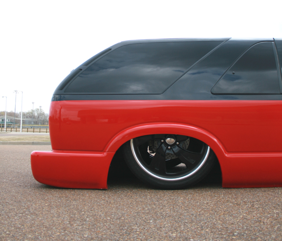 3" stock floor and 3" traditional = 6" body drop, doors sit about 1/4" from the ground; custom built hood; 98+ body style bumper with 2" added to the middle; raised hood and fenders 1.5" to clear the wheels; shaved: hood squirters, antenna, door handles, roof rack, 3rd brake light, gas door [relocated to the roof], tail lights, tag lights, rear wiper, passenger wiper; LEDs in rear bumper; painted Dupont Viper red and Kalapana black; suicide doors.