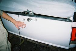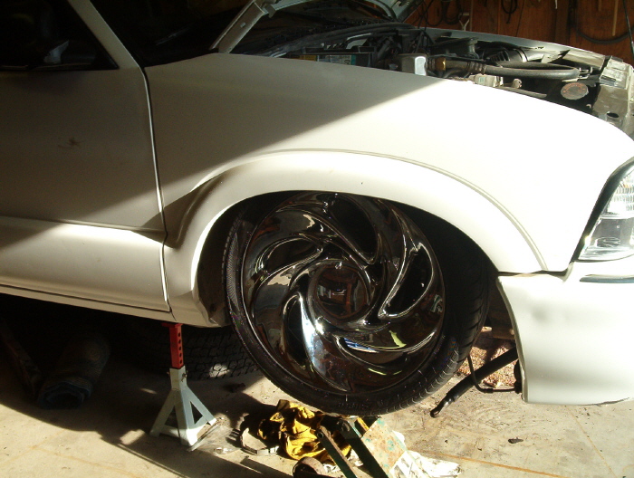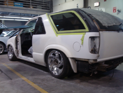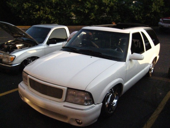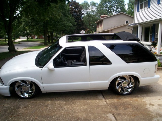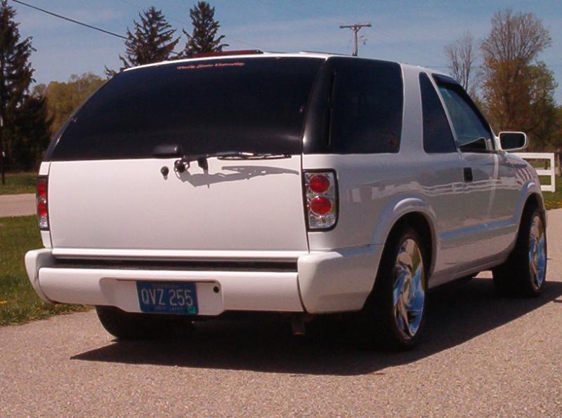 shaved handles, antenna, roof rack, tailgate, relocated 3rd brake light. '98+ headlights, billet grill, Envoy bumper, Cal-Vu Mirrors, 37.5" x 68" ragtop