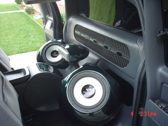 forgate ppi amps 6-alumapro 12" subs 13 focal seperates tv's everywhere ps2 out of air bag pocket custom sub enclosures dvd changer cd changer custom vinyl and painted fiberglass throughout truck.