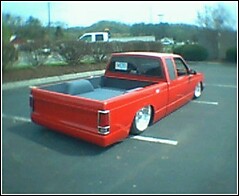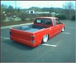 all the usual stuff shaved, Chevy Victory Red paint, updated GMC grill,goodmark cowl hood, 3 1/2 in. bodydrop on cab, 6 in. on the bed to keep stock floor in bed