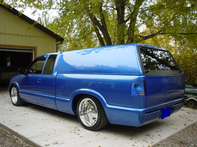 All work done by me, 4" belltech drop all the way around,17+8 boyd diablos ,ripped out exhaust from cab back rerouted coming out in front of back right tire,CHERRY BOMB glasspack muffler, steel GM factory rollpan, shaved tailgate handle, ripped out all intake hoses,most of engine compartment painted bright blue,silver brow,rain guards on windows,short billet antenna,windows tinted 20% up front 5% on back,shaved off all emblems,leer cap,wipers painted silver matching truck, cowl screen painted silver, (not shown in pics) green fog lights,all under truck blacked out