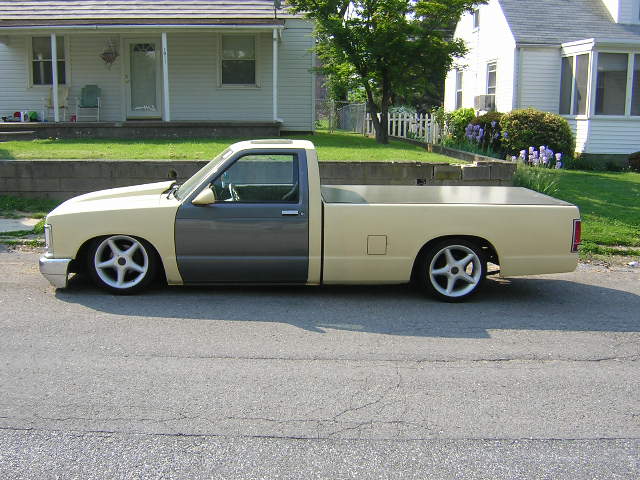 Toyota front bumper conversion w/billet insert/ 91-93 Grille conversion w/billet insert/ H4 headlights, 3" fiberglass hood, Shaved cowl, Body line shaved on fenders and tailgate and bed, shaved antenna, shaved emblems, shaved tailgate handle, license plate box molded in tailgate, frenched smoothie roll pan, street scene mirrors, yellow and gray primer...