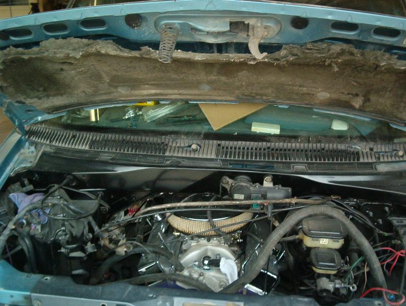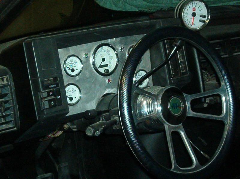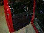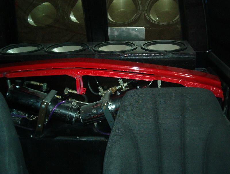4 Blazer bucket seats ( Back with red stripes) ,rear floor cut out and dropped 8" for 4 battery's, , pumps mounted on top of the bridge notch. black alligator(fake)on lower doors and the head liner and rear side panels, rest of interior painted satin black, new black carpet, and stuff...
