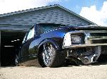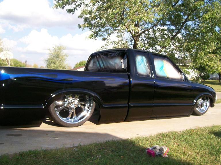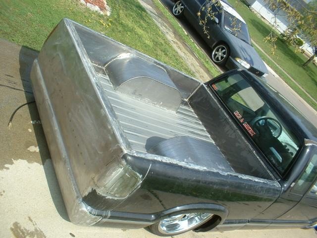 Sheet metal bed walls with the stock bed floor. Billet gas door frenched in the bed floor. Hand made tail light fillers from 16 gauge. Suicide doors, 10 inch LEDs.. Painted Viper black with Subaru blue ridge pearl flames. (pics soon)