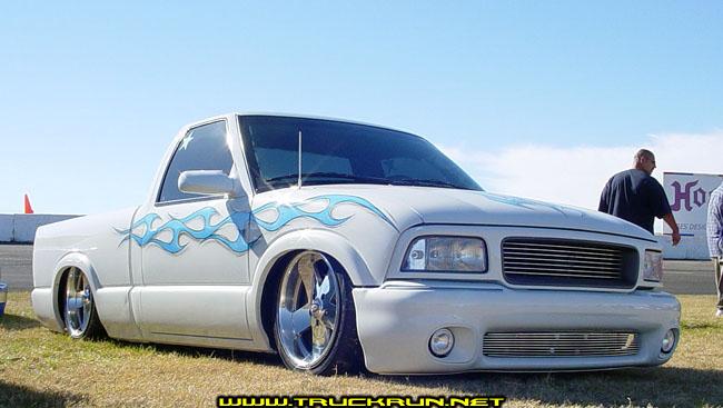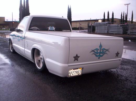 White w/ Light Blue Flames striped in black with stars shadowed throughout. 63 Stars throughout the suspension and tint and paint ect. 7" Star tail lights with LEDs