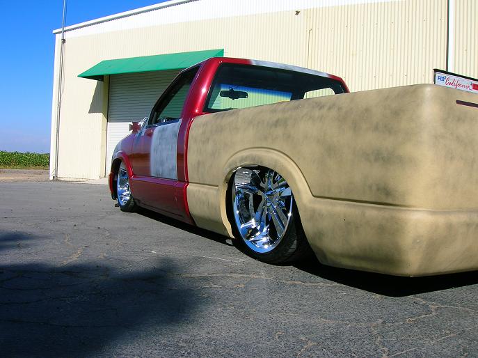 Front and rear air suspesion, 3/8 valves and line on Slam Specialty bags. New control arms and nothced out up front to lay a 20. The rear is set up on Settin' Trendz wishbone link and a huge notch to tuck a 22.