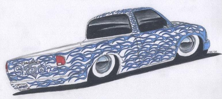 Billet Grille, Drag Specialities choppper mirrors, '33 Ford door handles, SHAVED 3rd brakelight, hood squirters, mirrors, doorhandles, tailgate. Steel rollpan, painted (by Ed Cain) black with red pearl flames (by me)