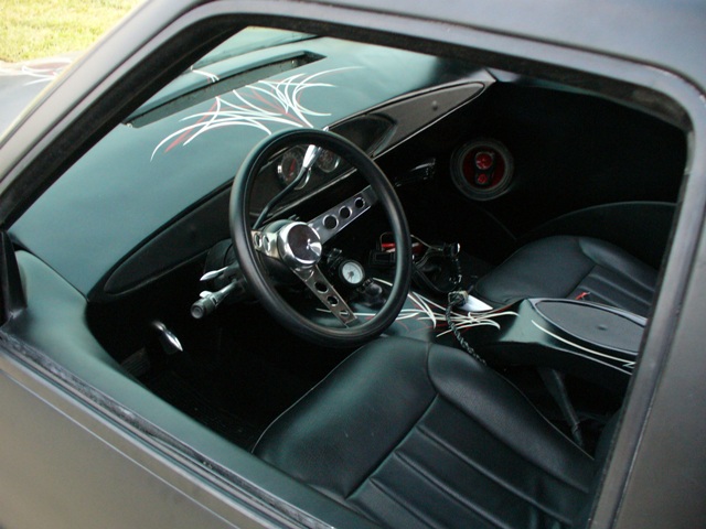 Satin black paint, Black leather seats, Pinstripped, Custom built dash, Door panels, Console, Subs and amp box, all done by Pat at Madd Concepts