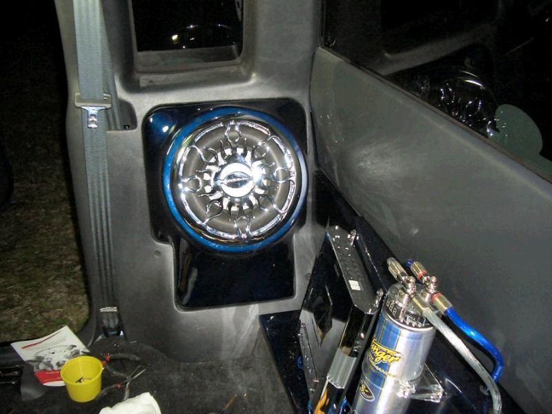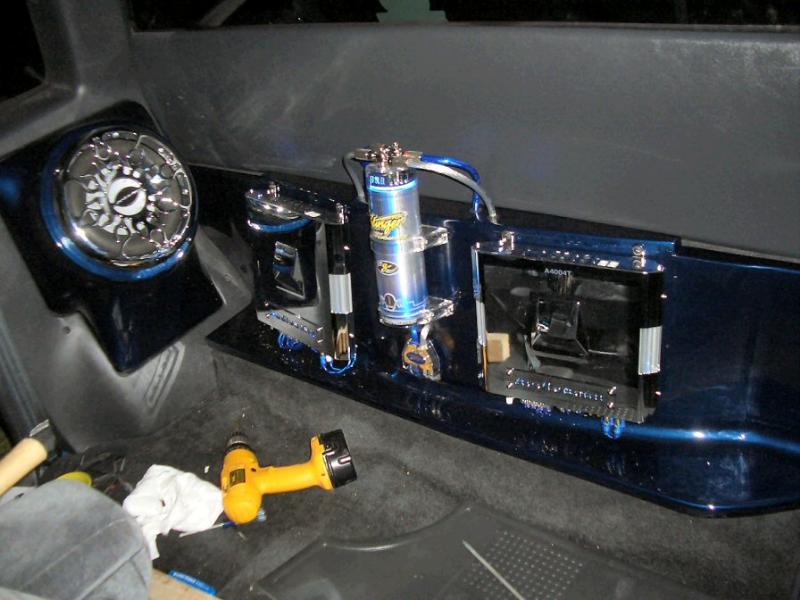 Pioneer DEH-7600MP, Audiobahn A4004T and A6004T amps, Audiobahn 4x6 plates in dash, Audiobahn 6.5 3way coax in doors, Audiobahn Flame-Q 10" sub in custom enclosure in place of jump seat, 1 Farad Stinger cap, all stinger wiring.
