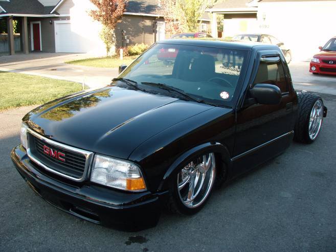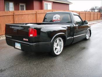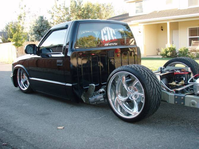 Baer rear disc's, Braided brake line's, 5-link Set-Up, Narrowed stock frame 5 1/2 inches, (8) 1/2 parker valves, (2) silver Air Zeniths,(2) 5 gallon SD tanks powdercoated titanium, Narrowed rearend powdercoated titanium, Shaved & smoothed frame rails,1/2 air line, 1/2 dump control valves, PTC fittings, Conti 2600's Back, Slams Up Front.