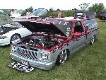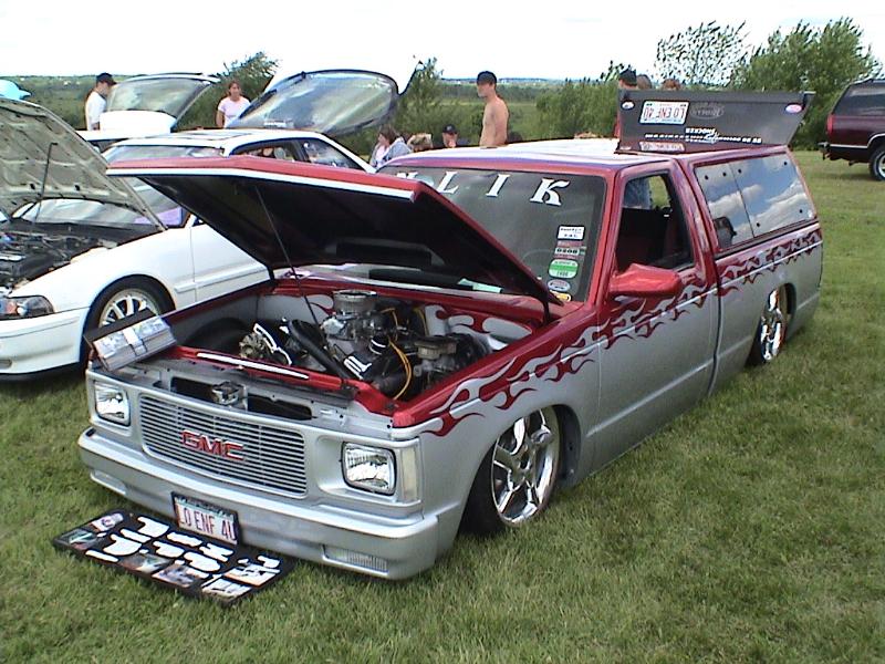 3" body drop, shaved door handles, locks,antenna, wipers, fuel door, tail gate and bumper bolts. custom fabed firewall. custom hood and mirrors. bed to cab walk through. metallic red and silver paint with tribal flame design.