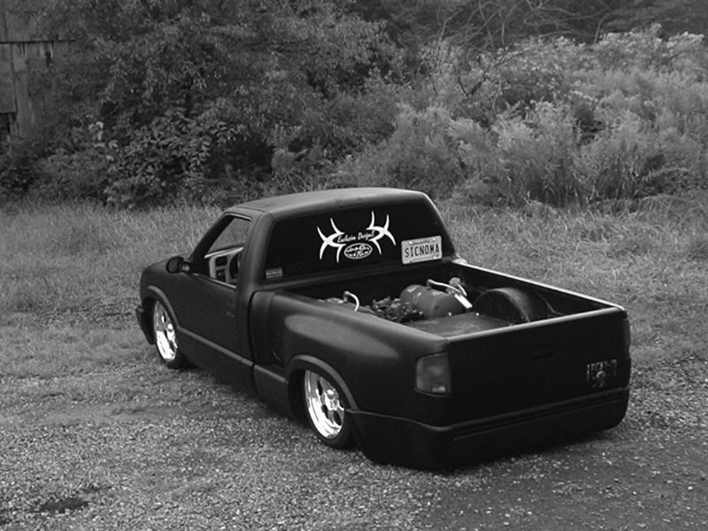 shaved rear steps w/ smooth rollpan. shaved front steps. billet grille. 5% tint back and 35% sides. bed has been tubbed and sprayed with bed liner. relocated license plate. shaved antenna