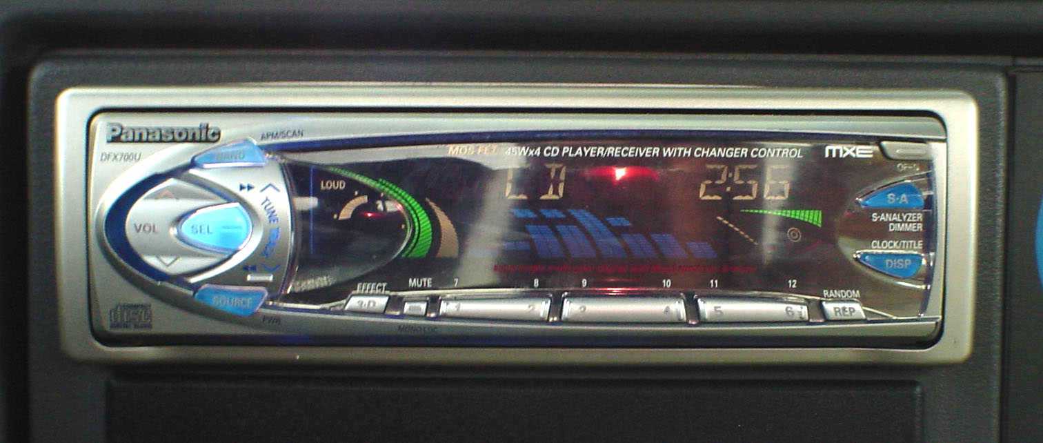 Glowing blue Panasonic AM/FM/CD head unit, 1 12" Infinity Kappa subwoofer powered by Lanzar 800W amp (pictured is a Crunch 200W. the 800 has been shorting out lately). also have Infinity Kappa 5 1/4" in the doors and tweeters located in pods on the windshield posts.