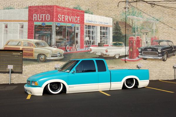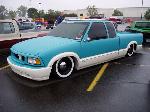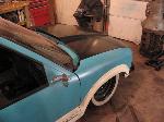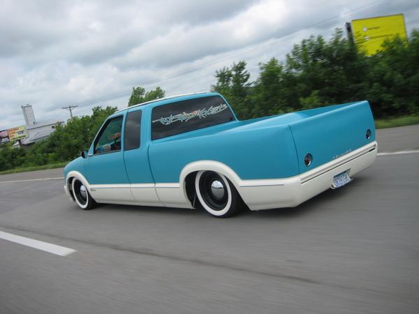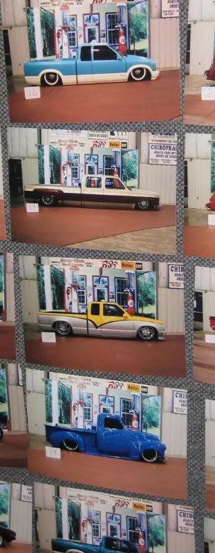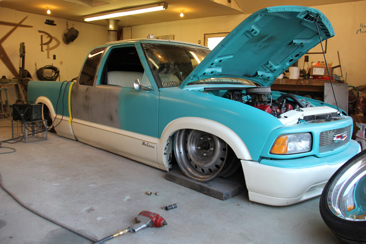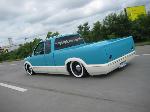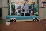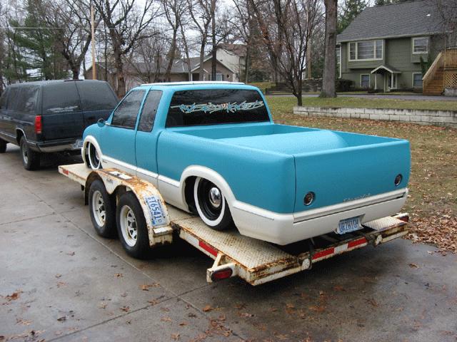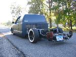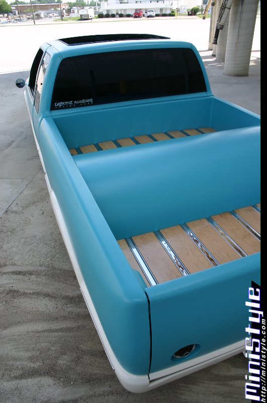 shaved and sealed in hot rod flatz primer/sealer, Uni-tub notch cover in bed, wooden bedfloor and smoothed out bedwalls done by crazytalkcustoms and old skool kustoms and creative illusions, gas filler in bedfloor, big hole in the roof to let the sunshine in and removable fiberglass roof section (tuck n' rolled), shaved everything, 57 mirrors, 1950 pontiac tailights, body dropped at creative illusions, custom grille made from a peterbilt grille