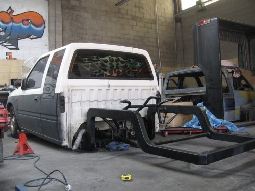 Bag the front, crossmembers, sheet the tray in. Shave everything. Custom front bar and billet in all grills. Bodydrop and respray. 20s and an interior retrim. 1uz-fe engine transplant with supra 6-speed box. LSD.
