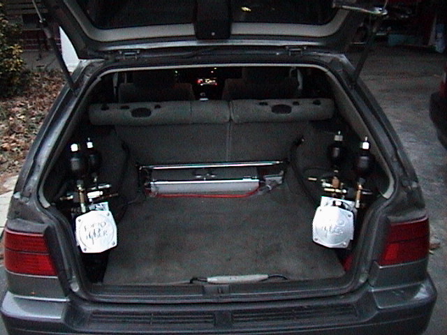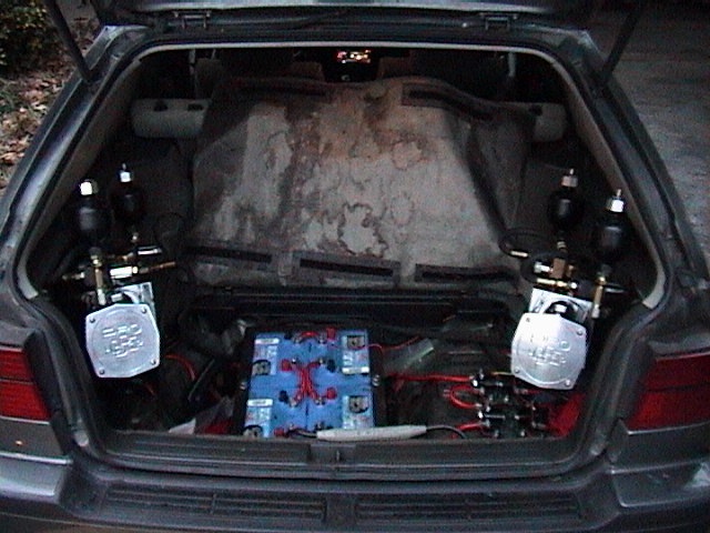 prohopper two pump setup with accumulators for a smooth ride. four optima blue tops in the spare wheelwell. used all parker fitting cause the ones that come in the kits suck.