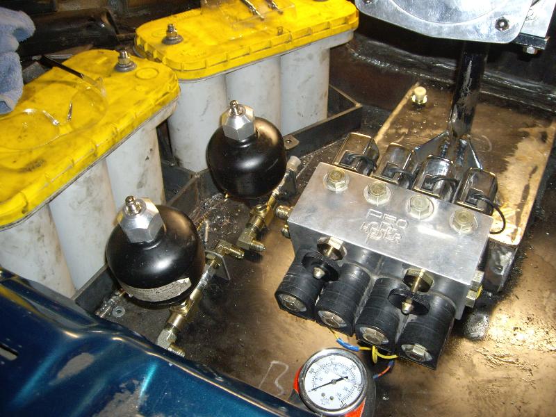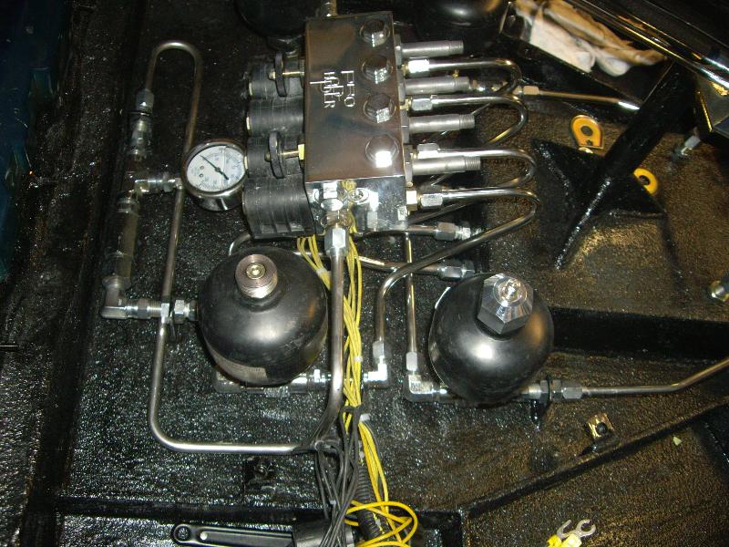 1 pump 8 dump pro hopper manifold, 8's in the Front, 12's in the Back with powerballs, 2 link rear arms made out of 1 3/4inch .250 wall DOM with 7/8 heims, 1/2 inch plate rear cradle Accumulators for a smooth ride, Parker fittings, Hardlined, 4 Optima D31A yellow top Batteries sunken in the the spare tire holder, Polished DC front strut bar, rear is tubed for 22's