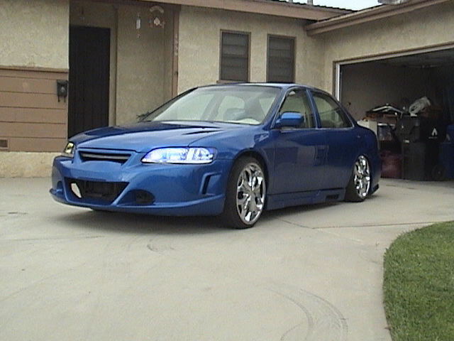 EVO II front clip, black widow sides and rear skirts, ion headlights, altezza tail lights (being shaved soon, so dont clown too hard). Shaved door handles, squirters, molding and roof gutter. Painted Long Beach Blue.