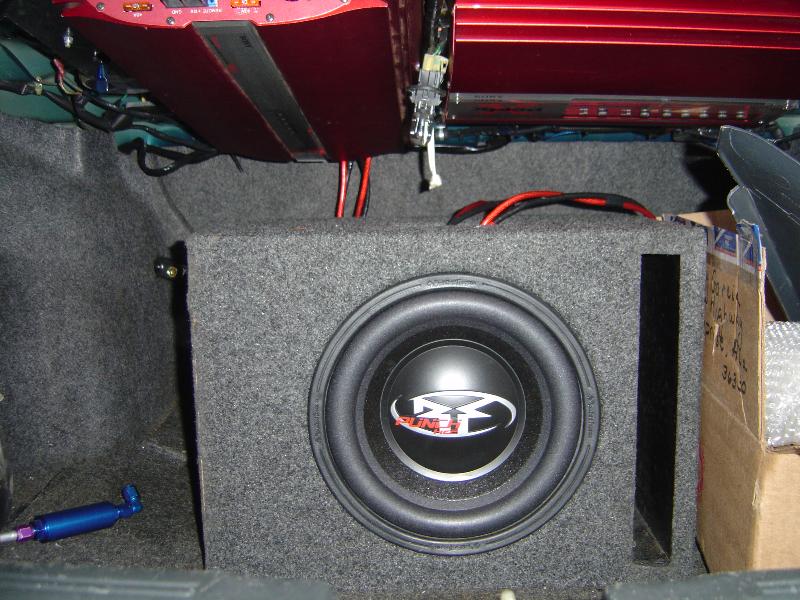 clarion head unit, clarion in-dash tv, dvd player in backseat cushion, rockford fosgate highs with a 500 watt sony amp pushing them, and 1 10" he2 with a 2000 watt sony amp pushing it.