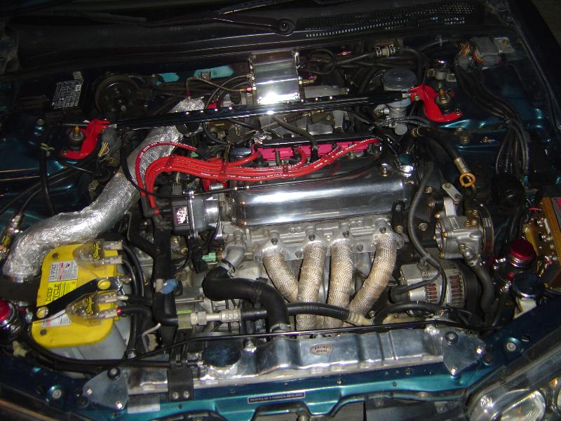 F22, HPR cold air with AEM bypass valve, Venom fuel injectors, OBX fuel rail, AEM fuel filter, Skunk2 cam gear, MSD 7AL2, MSD timing control, Taylor 10.4 wires, HPR ceramic header, racing cat, Greddy cat back, Venom 400, Zex nitrous system, B&M fuel pressure regulator, Aluminum racing radiator