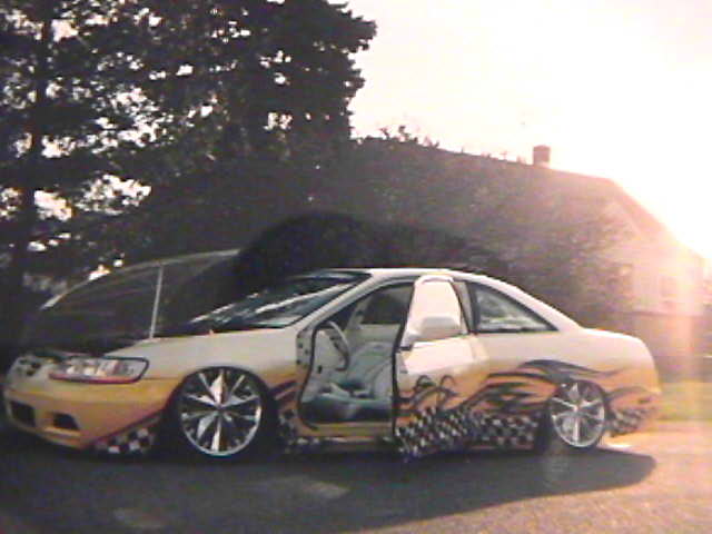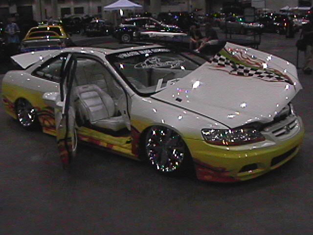 shaved doors,suicide doors,tilt hood, custom bubbles in hood where the bags are..bags on upper control arms,gas door,tail lights, custom lights in bumper.yellow fading into pearl white/w graphics