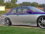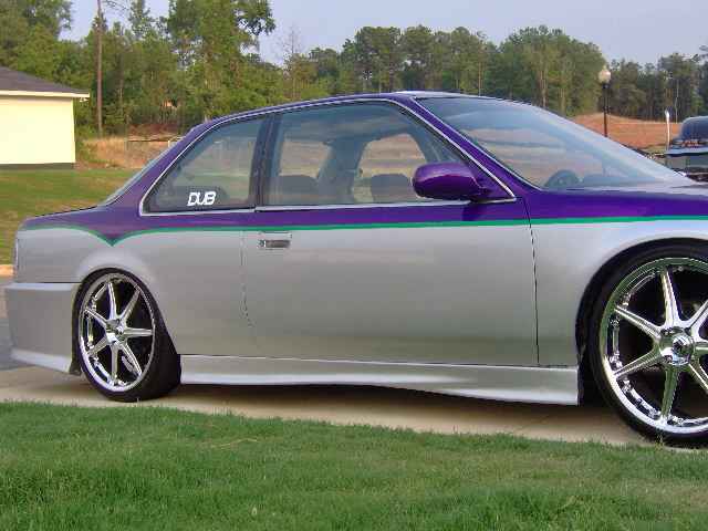 two tone ppg custom purple and silver divided by a house of color candy green stripe.(Purple appears to be blue) Fully shaved besides handles and taillights. Full body kit and black widow wing. Custom tag on the way (GOTDUBZ) SOLD