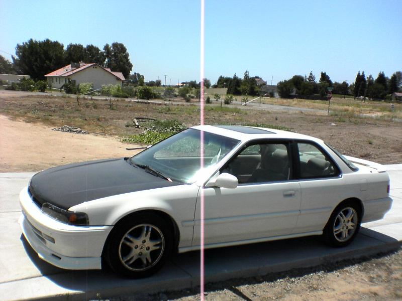 custom front lip, carbon fiber hood, 93 front end, custom red & clear tails, 1 piece projector headlamps, and it's painted integra type R championship white
