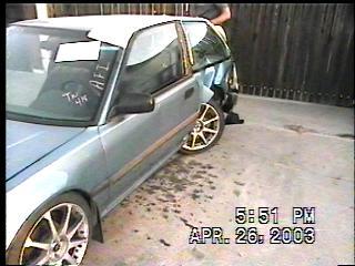 straight body with small ding in rear quarter...haha. if you look in the rear quarter the window is still intact with the metal shoved up behind it.