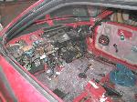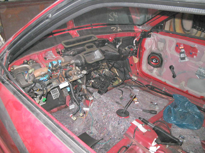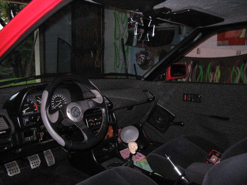 tweeded everything with dark and light gray, integra ls seats and center console with armrest, ichibahn pedals and floor plates, flamed tweed roof liner, billet shift knob and a monkey skull shift knob, custom rear half made to hold soundsystem and air ride components, hand pinstripped gauge cluster hood and rear hatch cover, billet moon eyes maltese cross mirror with shrunken head, raised "666" dice on rear cover behind seats